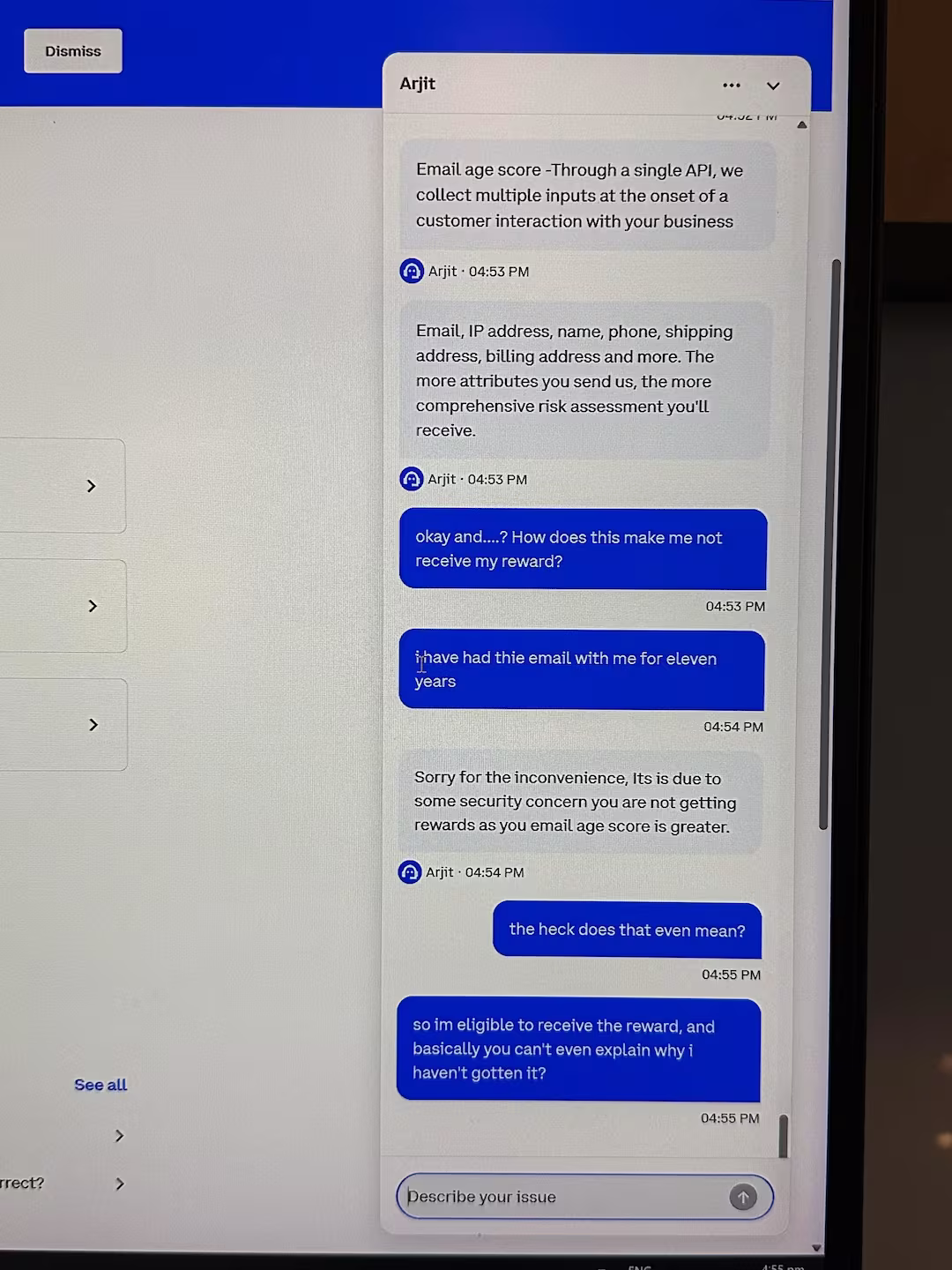 Despite repeated attempts to clarify the issue, the user received more responses that failed to address the problem clearly. They explained that their email had been active for over 11 years, yet Coinbase still claimed that they were not eligible for the reward. The reasons mentioned in these messages ranged from duplicate account issues to a low “emailage” score—a score that rates the risk associated with an email address.