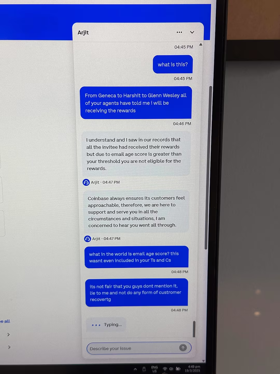 As the Reddit thread grew, many other users began to share their experiences. Several reported that they, too, had not received their rewards. The common theme was that Coinbase support messages were vague and unhelpful. Some users were told that their accounts had issues like duplicate registrations, while others were informed that their “emailage” score was too low, even if they had used the same email for years.